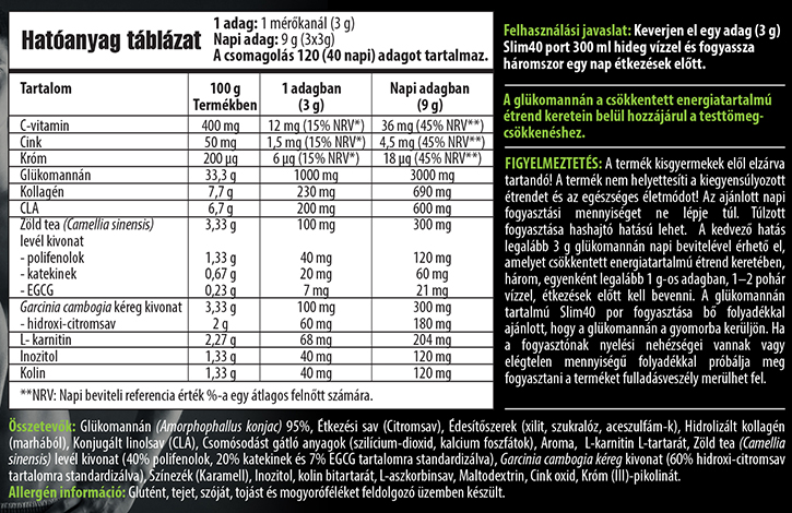 Felhasználási javaslat: Keverjen el egy adag (3 g) Slim40 port 300 ml hideg