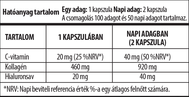 Összetevők: Hidrolizált kollagén (marhából), Kapszulahéj [Zselatin, Színezék (Titán-dioxid)], L-aszkorbinsav, Hialuronsav, Tömegnövelő szer (Cellulóz), Csomósodást gátló anyagok (Szilícium-dioxid, Zsírsavak magnéziumsói).