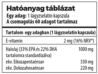 Összetevők: Halolaj (33% EPA és 22% DHA tartalomra standardizálva), Kapszulahéj